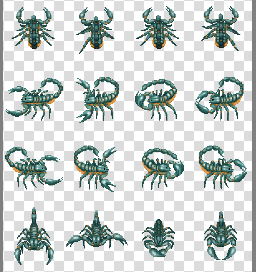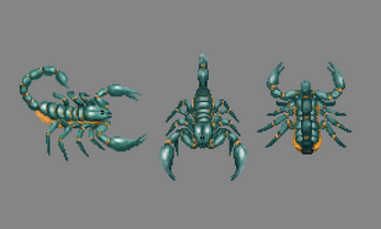 This pack contains a scorpion character in top-down perspective with basic animations: walking, attack and dead in four directions.